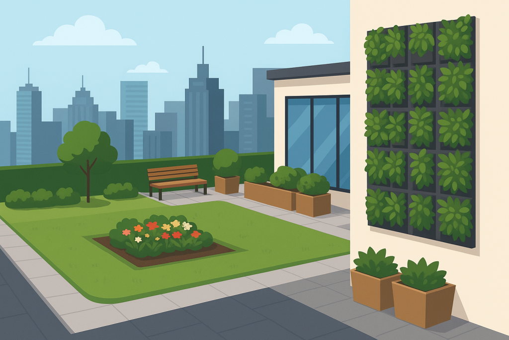Çatı bahçeleri, binaların üst kısımlarını yeşillendirerek oksijen üretimi, ısı yalıtımı ve estetik değer kazandırır. Dikey bahçeler ise bina cephelerini doğayla bütünleştirir, çevre dostu bir görünüm sunar.