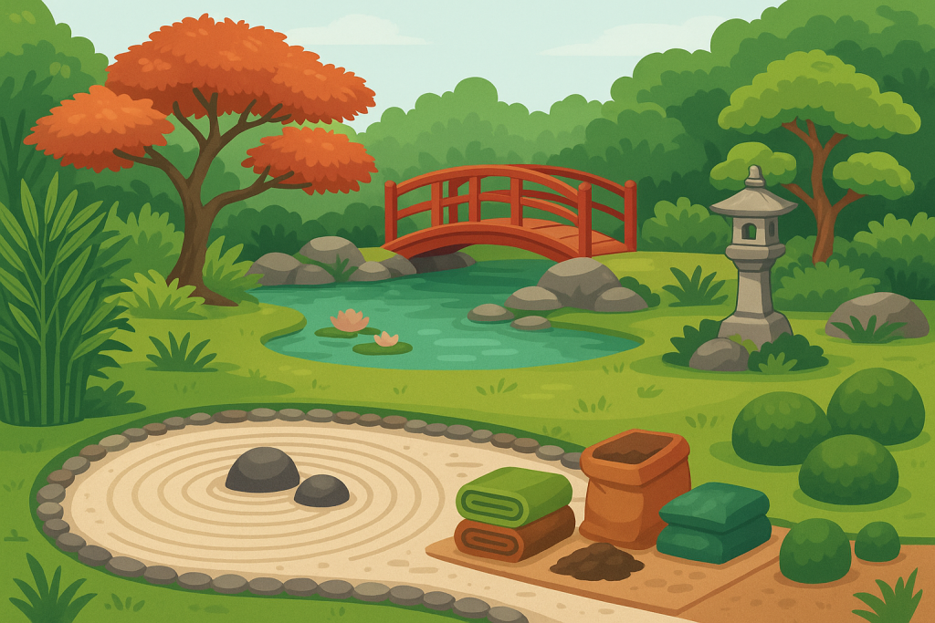 Göletler, taş köprüler, bonsai ve Japon akçaağacı gibi türlerle tasarımlar.