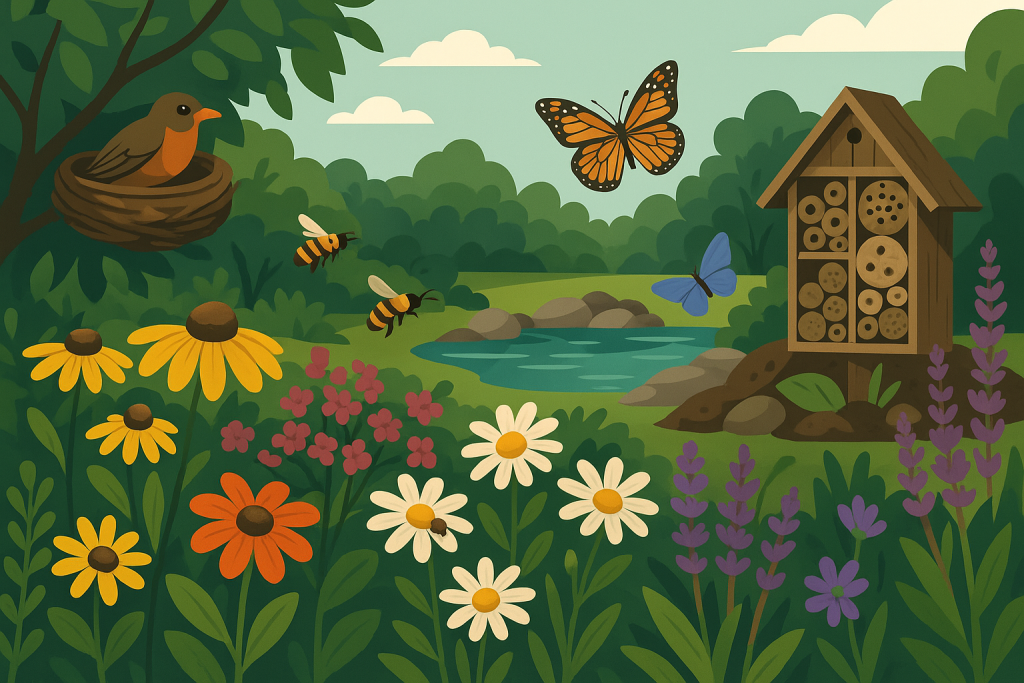 Kuş yuvaları, böcek otelleri ve doğal yaşam alanları.